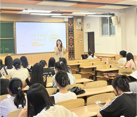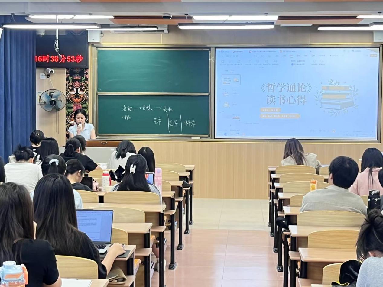 活动伊始,唐瑗彬老师系统阐述了读书会的意义,强调其作为知识输入与思维训练平台,能成就学生学术生涯的奠基之石。主读分享环节,汤南熙同学凭借精心准备的PPT和生动案例,将抽象哲学理论具象化,梳理书中核心观点并结合现实情况展示其实际应用价值,引发共鸣,现场气氛热烈。多元视角分享环节,各小组从历史背景、方法论等不同角度深入分析《哲学通论》,充分展现思维的碰撞。