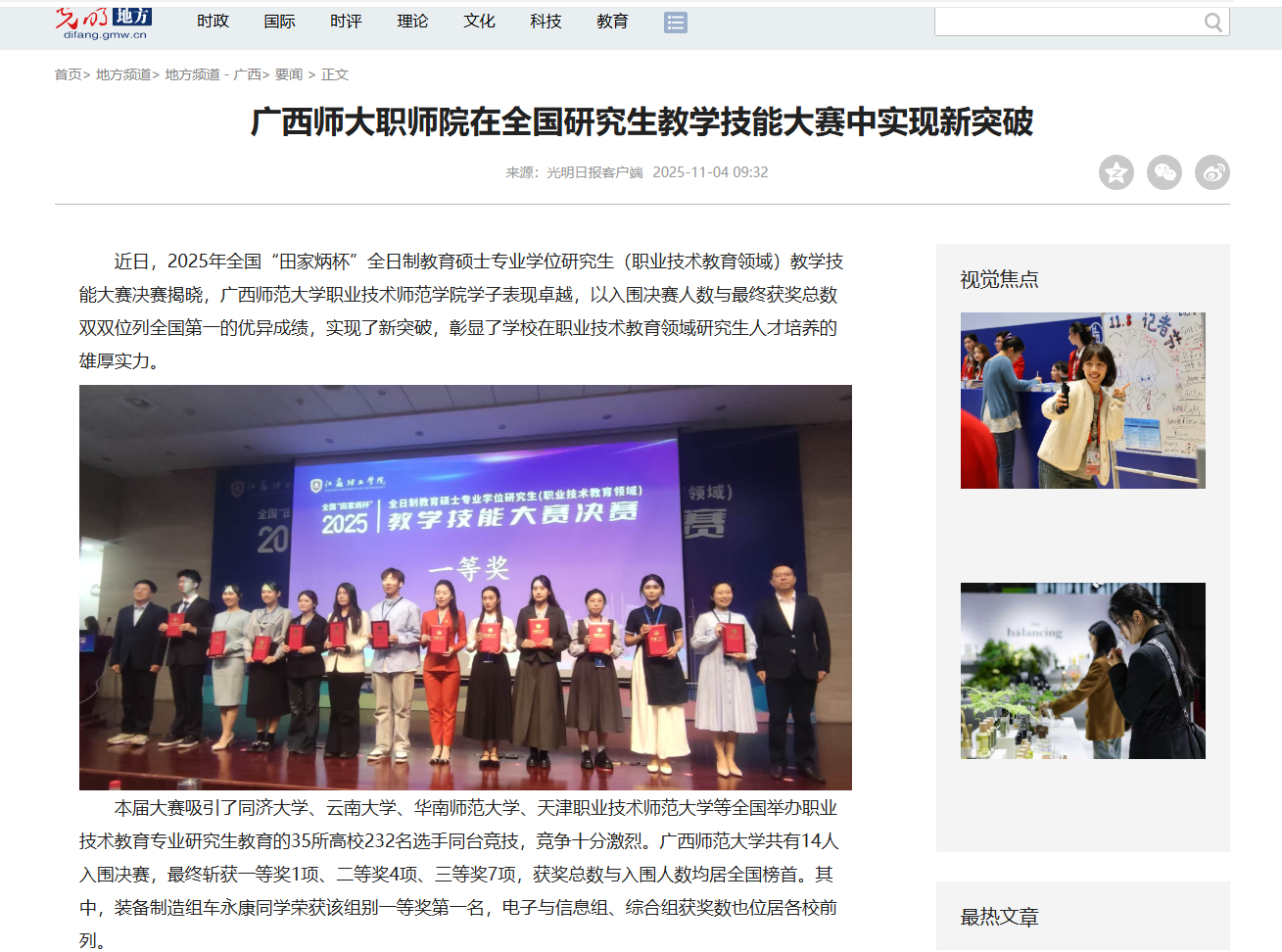 近日,【光明网】关注报道我校职业技术师范学院在2025年全国“田家炳杯”全日制教育硕士专业学位研究生(职业技术教育领域)教学技能大赛决赛中,凭借入围决赛人数与最终获奖总数双双位列全国第一的优异成绩,实现了新突破,彰显了学校在职业技术教育领域研究生人才培养的雄厚实力。