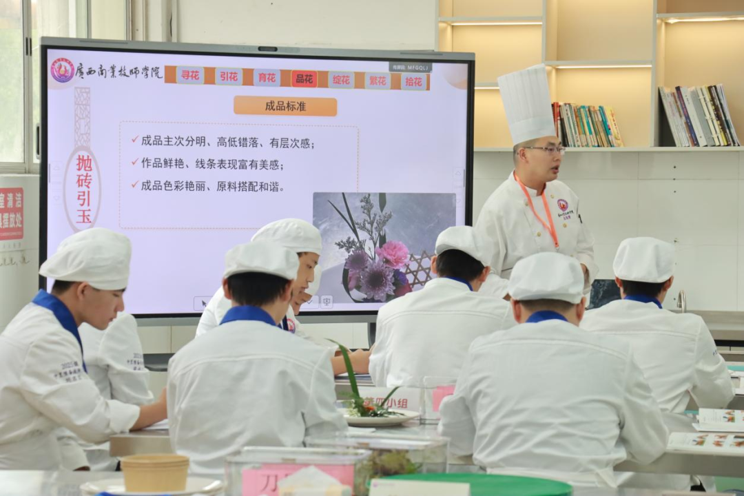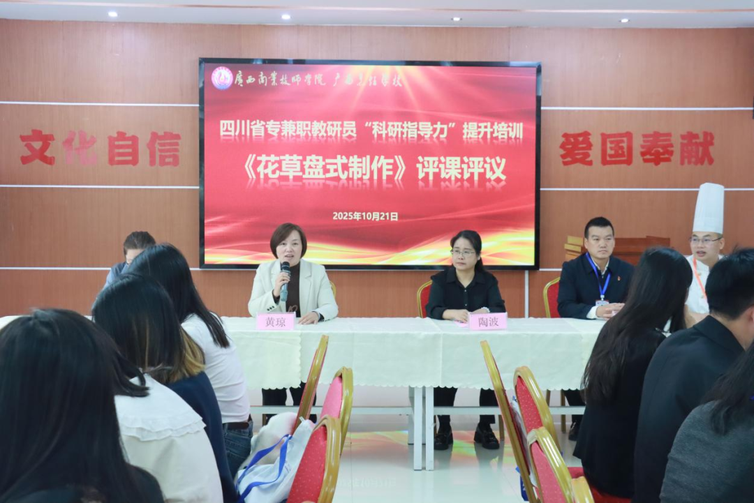 在广西商业技师学院,陆海青老师的《花草盘式制作》课程设计精巧、师生互动频繁,展现了扎实的教学功底。随后的评课议课环节由国培基地陶波老师主持,川桂两地教研员围绕教学内容、方法、效果展开深入交流,校方代表黄琼介绍了一体化课程建设成果,活动在颁发聘书与合影中圆满落幕,为跨区域职教合作树立了新标杆。