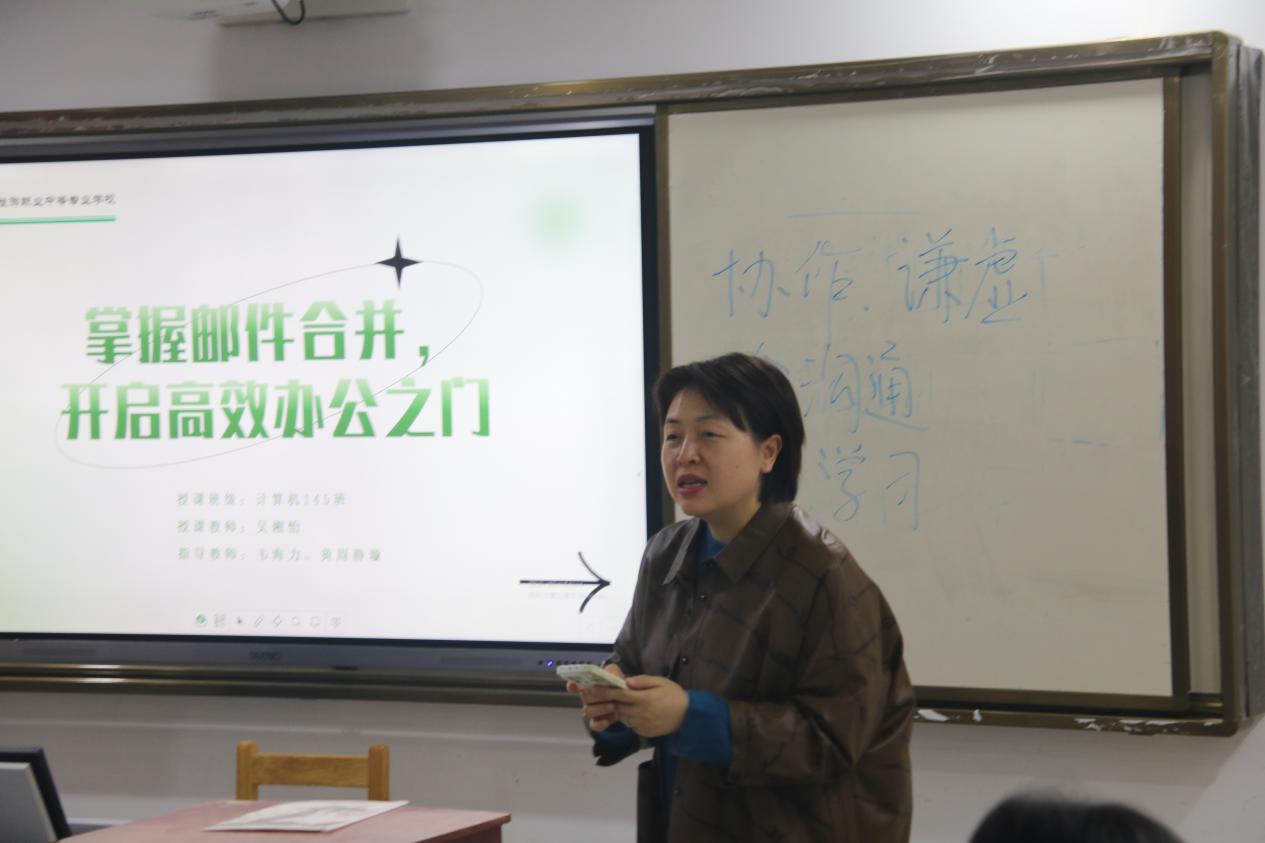 在桂林市旅游中等专业学校,学科教学法老师谭静副研究员主持听评课交流活动,以吴湘怡老师的《掌握邮件合并,开启高效办公之门》计算机实操课为载体,开展课例研讨交流。课程以“真实职场场景”导入,通过“招生办助理批量制作录取通知书”的任务,引导学生理解邮件合并的核心原理与操作流程。教学中,吴老师巧妙融入“职业责任心、踏实肯干、精益求精”等素养教育,强调“数据源核对”“预览检查”等细节,避免“批量返工”,在技能训练中自然渗透思政元素,培养学生的职场沟通意识与团队协作精神。