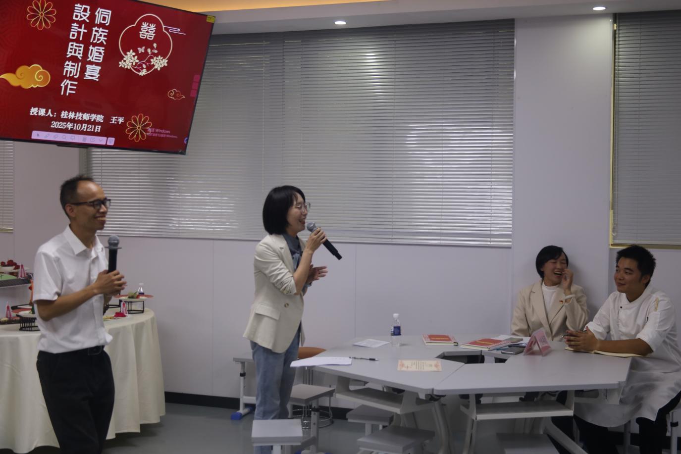 在桂林技师学院,课程思政教学研究中心主任连智平主持开展了一场听评课交流活动。在本次研讨活动中,以桂林技师学院副院长王平主讲的《侗族婚宴设计与制作》优质示范课为载体,与四川省专兼职教研员培训班学员共同探讨课程思政的方法。王平副院长以“真实岗位任务+民族文化浸润”为主线,构建“竞赛驱动、企业赋能、思政融入”三位一体的教学模式。学生分组模拟中餐厨房岗位,完成从设计到成本管控的全流程任务,并在成果展示中融入侗族文化元素。行业导师与企业总监现场点评,实现“技能培养”与“价值引领”的无缝衔接,展现了职业教育课堂的育人实效。