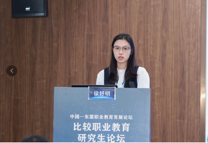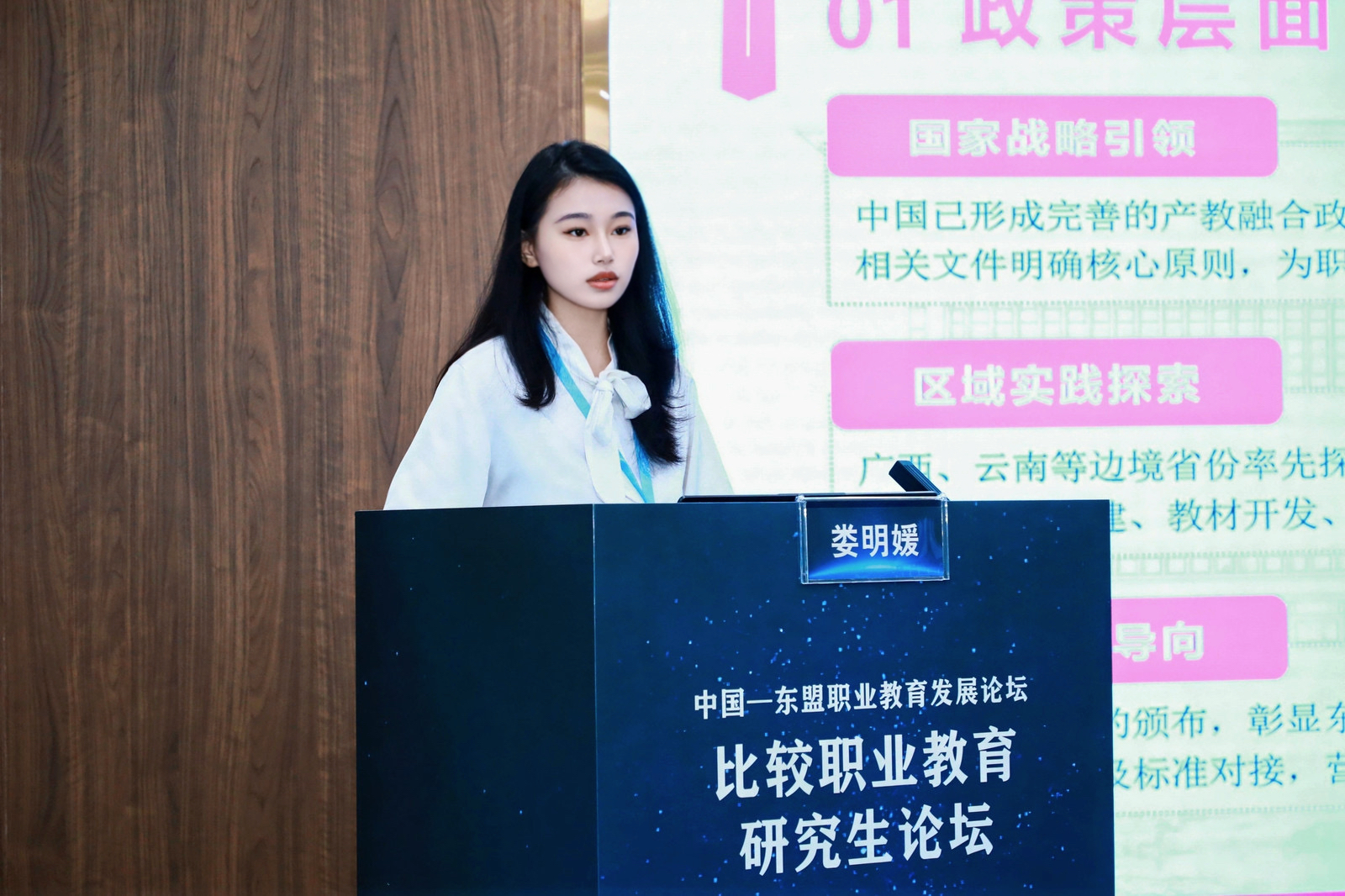 在“比较职业教育研究生论坛”平行论坛上,学院王棒博士应邀作为点评专家。硕士研究生徐好明聚焦职业教育对外开放,针对职业教育国际化面临的四大瓶颈,提出了“四维融合机制”的突破方案;硕士研究生娄明媛、梁沁瑜两位同学深入研究“中国—东盟职教产教融合”的现实堵点,提出了完善政策对接、构建激励机制、打造数字平台、深化跨境合作等四大策略,为论坛增添了亮点。