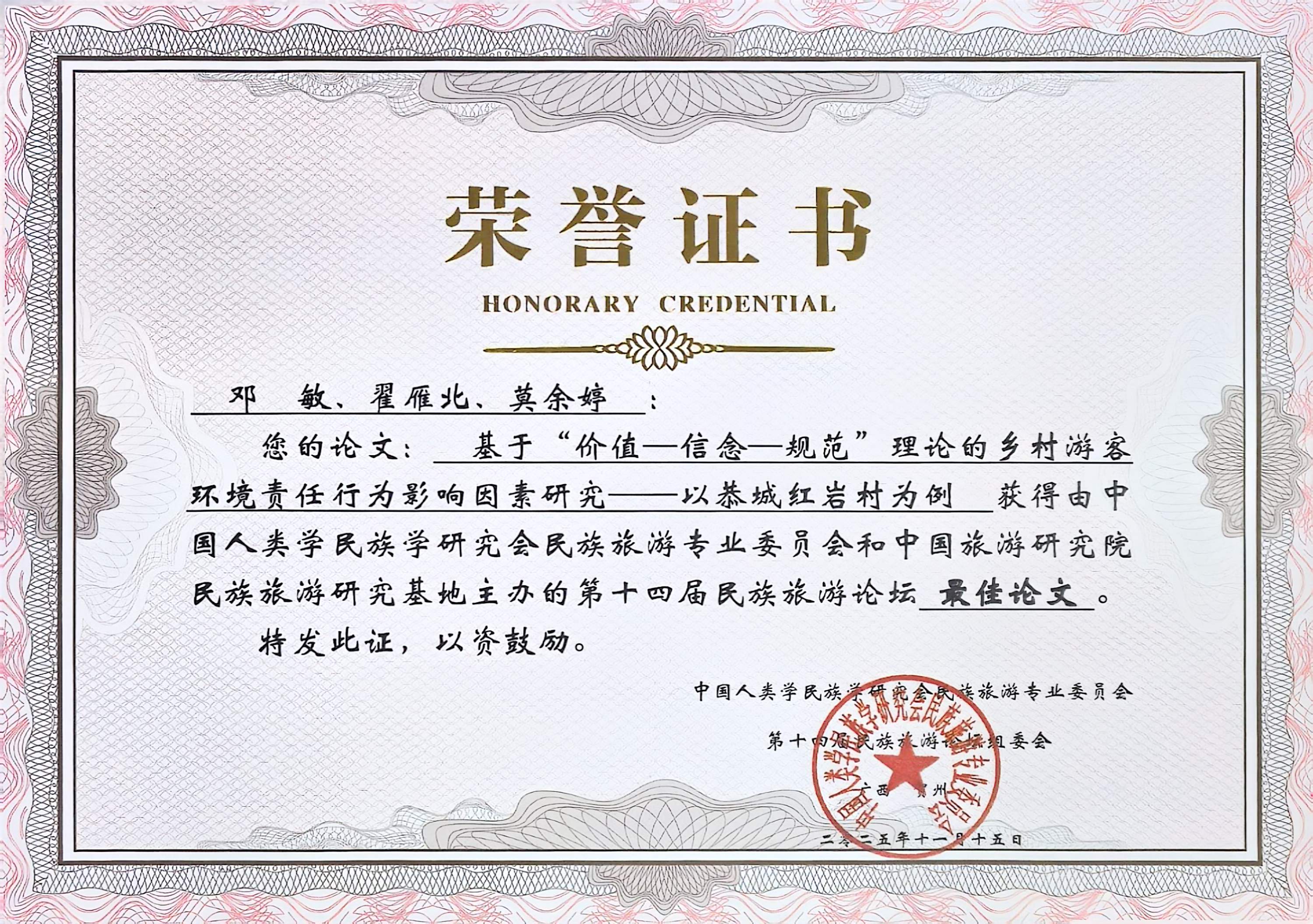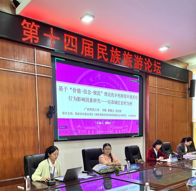 我院旅游管理系邓敏老师、翟雁北和莫余婷同学共同完成的论文《基于“价值—信念—规范”理论的乡村游客环境责任行为影响因素研究——以恭城红岩村为例》入选参会。该论文系邓敏老师主持的国家社会科学基金西部项目《南岭瑶族传统村落文化保护的旅游社会学研究》(21XSH018)系列成果之一。翟雁北同学在“文旅发展与传统村落保护”分论坛中汇报论文,论文获评为第十四届民族旅游论坛最佳论文。会议期间,邓敏老师受邀担任“数字化赋能民族地区乡村全面振兴”分论坛评议人,对参会论文进行系统点评。