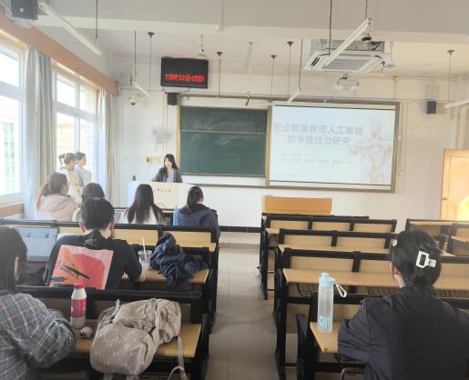 随后,两组主读小组依次结合PPT完成学术成果分享。第一组以《职业教育教师人工智能教学胜任力研究》为题,汇报人罗霓同学携组员围绕国家教育数字化转型政策导向,构建了“AI技术应用能力—AI融合教学能力—产教协同AI能力”三维核心体系,通过梳理上海地区职业院校教师现状,分析了个人、学校、行业层面的影响因素,并结合成都农业科技职业学院与科大讯飞的典型案例,提出“四位一体”的提升路径。第二组则以《人工智能赋能职业教育研究》为主题,聚焦“标准化技能培养与个性化职业成长的调和”核心问题,整合行为主义、人本主义与ADDIE模型三大理论,设计了“文献研究—德尔菲法论证—行动研究—混合评估”的完整研究框架,明确了技术融合、个性化学习、教育治理三大研究空间与针对性对策。