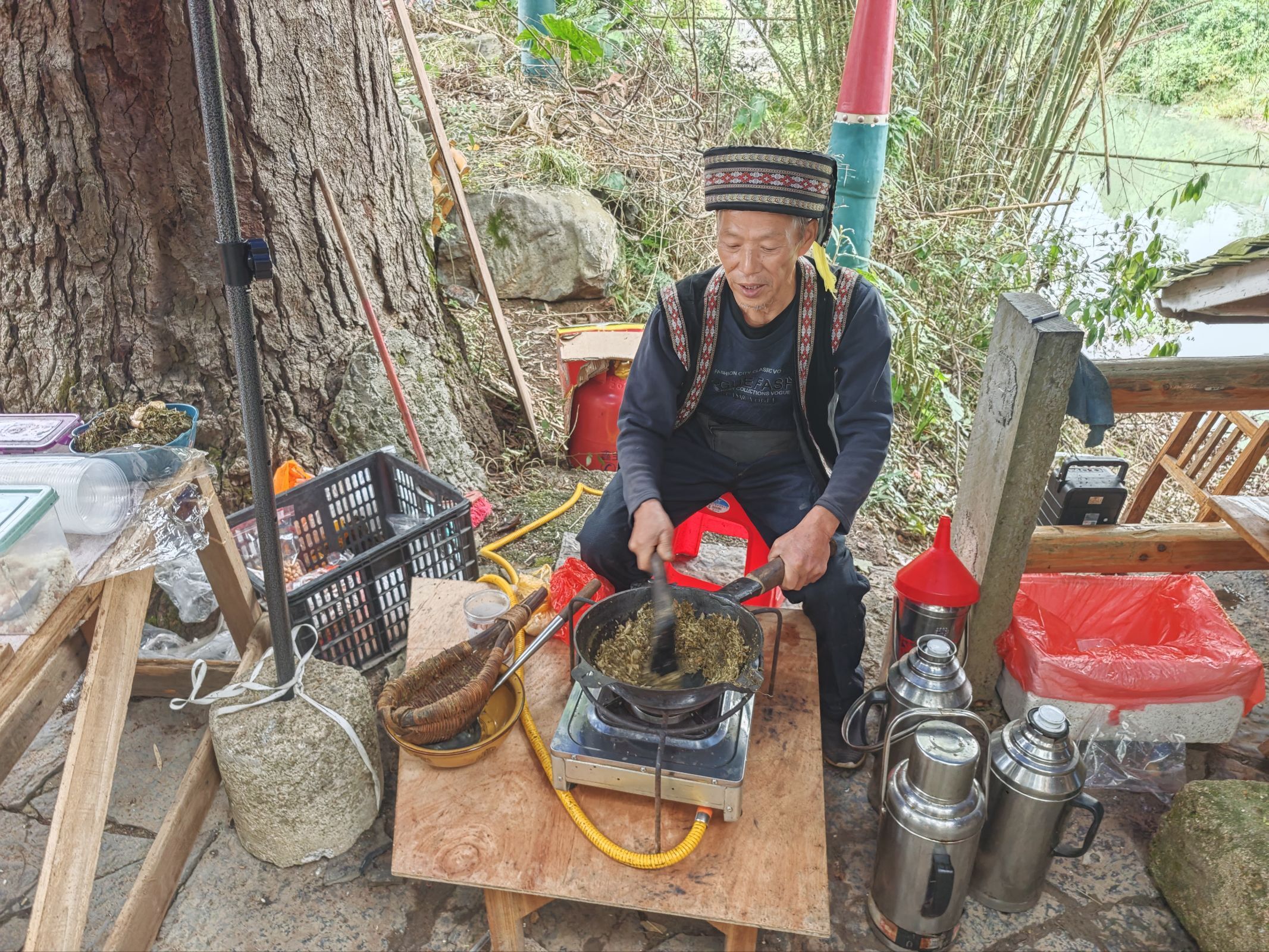 随后,师生团队沿青石板路穿越标志性风雨桥,沉浸式走访红岩村核心景区。此时的红岩村被金黄柿果点缀得暖意融融,月柿节热潮让村落尽显活力。沿街商铺内,柿饼、柿子酒、柿子冰激凌、柿子片等传统衍生品琳琅满目,柿子糕点、柿子酱等创新深加工产品同步亮相,全方位展现了柿子资源的多元转化路径。与此同时,油茶制作技艺、桃胶手工加工等非物质文化遗产项目亦吸引了师生们的重点关注:村民现场演示油茶传统熬制工艺,茶香与姜香交织弥漫;手工桃胶搭配本地蜂蜜制成的特色甜品,成为游客青睐的爆款。师生们边走边调研,与摊主深入交流产品研发逻辑、定价策略及销售渠道,系统厘清了红岩村“以柿为核、多元业态融合”的产业链运营模式。