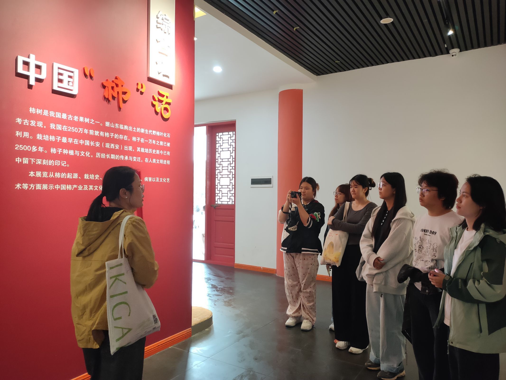 研学首站,师生团队走进月柿博物馆。在邓敏教授的细致讲解下,同学们系统梳理了柿子的起源演变、栽培历史与全球分布格局,全面掌握了从传统种植技艺到现代标准化培育体系、从品种分类到病虫害防治的全链条知识,深刻领略了月柿背后蕴含的深厚历史底蕴与文化艺术价值。馆内丰富的图文史料、实物展品及互动体验装置,生动展现了恭城“中国月柿之乡”的产业优势,更直观呈现了红岩村从传统农业村落向数字生态乡村的转型轨迹——通过数字化种植监测、线上营销平台搭建等创新举措,让古老柿产业焕发蓬勃生机。恰逢金秋时节,红岩村年度金秋月柿节正火热举办,博物馆外节庆氛围浓厚,为师生们提前勾勒出乡村旅游的鲜活业态图景。
