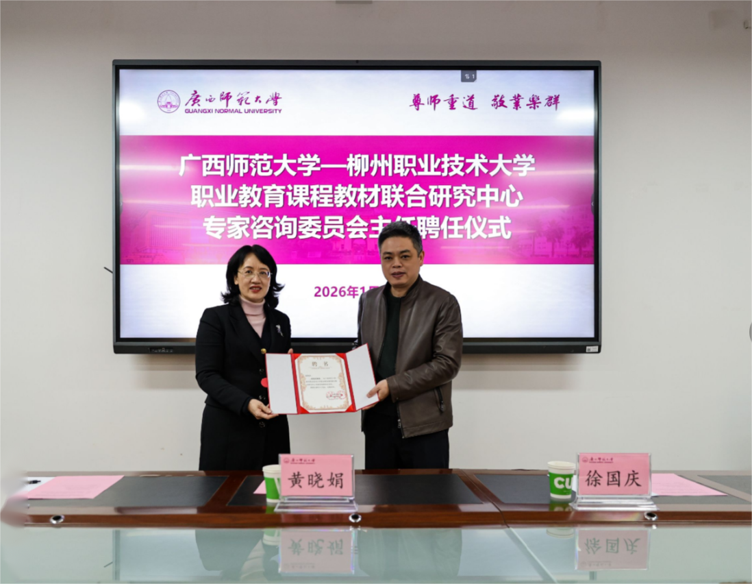 会上,黄晓娟副校长为徐国庆教授颁发专家咨询委员会主任聘书。柳州职业技术大学副校长陈正振代表研究中心向徐教授表示诚挚感谢,并对中心未来的重点工作和研究计划进行部署。本次活动标志着两校在职业教育研究领域的合作迈入新阶段。未来,研究中心将以专家咨询委员会为核心智库,紧密对接区域产业发展需求,持续深化课程教材理论创新与实践探索,努力建设成为立足广西、辐射全国的研究高地与智库平台。