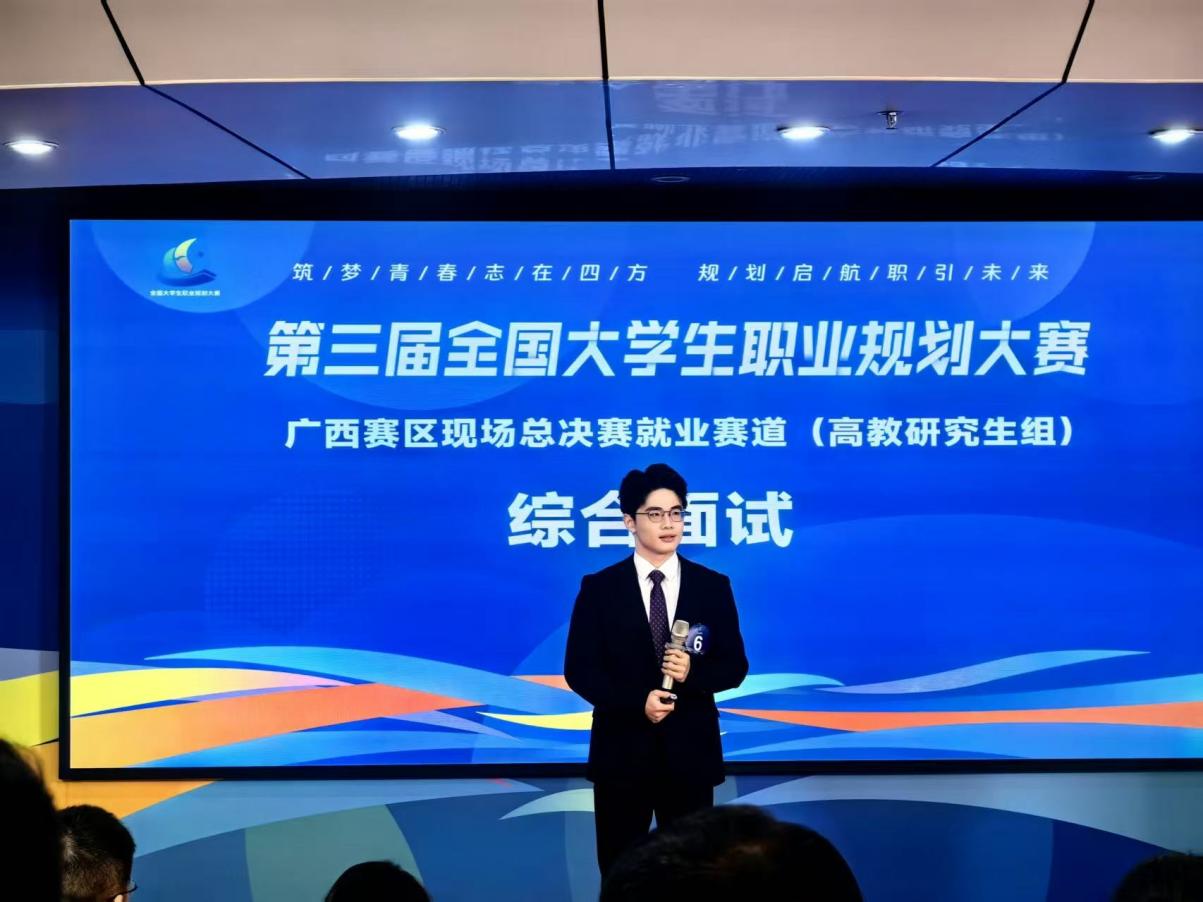 近日,第三届全国大学生职业规划大赛广西赛区总决赛在南宁师范大学明秀校区落幕。职业技术师范学院2025级职业技术教育专业硕士研究生杨万里(指导老师:秦国锋、李燕)凭借扎实的专业积累、清晰的职业规划与精彩的现场展示赢得高度认可,最终斩获就业赛道(高教研究生组)金奖。