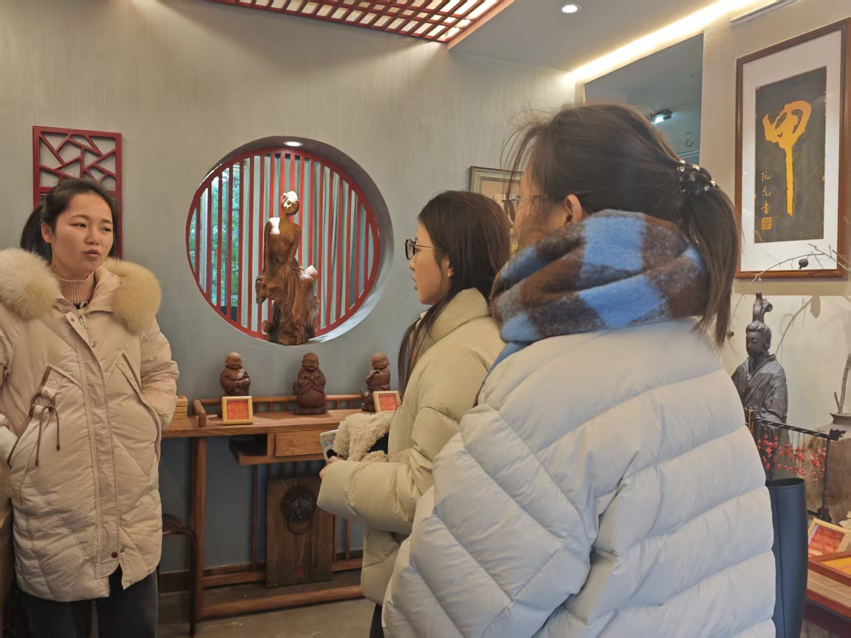 团队紧扣“非遗柚罐技艺的活态传承与文旅融合”调研主题,首站抵达桂林东西巷柚罐非遗手工馆,开启沉浸式调研之旅。在手工馆内,团队成员与师傅面对面深入交流,详细探寻柚罐技艺的历史渊源、核心工艺特色,以及当代创新改良成果,亲身触摸传统非遗背后的匠心与温度。