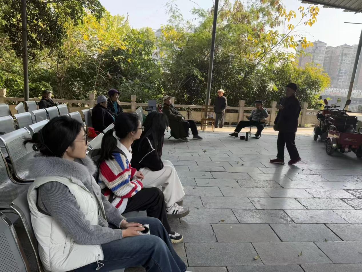 为感受活态传承魅力,实践团前往永福街头广场,观摩当地老年彩调队展演。老艺人们以桂柳方言演绎经典唱段,尽显彩调载歌载舞的艺术特质,赢得群众阵阵掌声。随后,队员们与老艺人进行交流,深切体会到了彩调在民间的深厚根基,以及其融入当地群众精神生活的独特内涵。