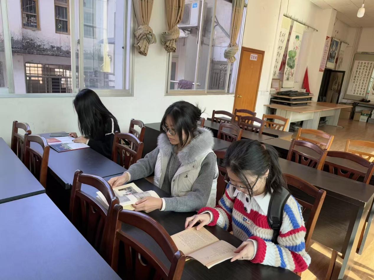 实践团首站到访永福县图书馆,在工作人员的指引下翻阅彩调剧本手稿、地方文化志等资料,系统梳理出彩调从明末清初起源到2006年入选国家级非遗的发展脉络,在经典剧目的研读中体会其乡土特色与艺术价值。