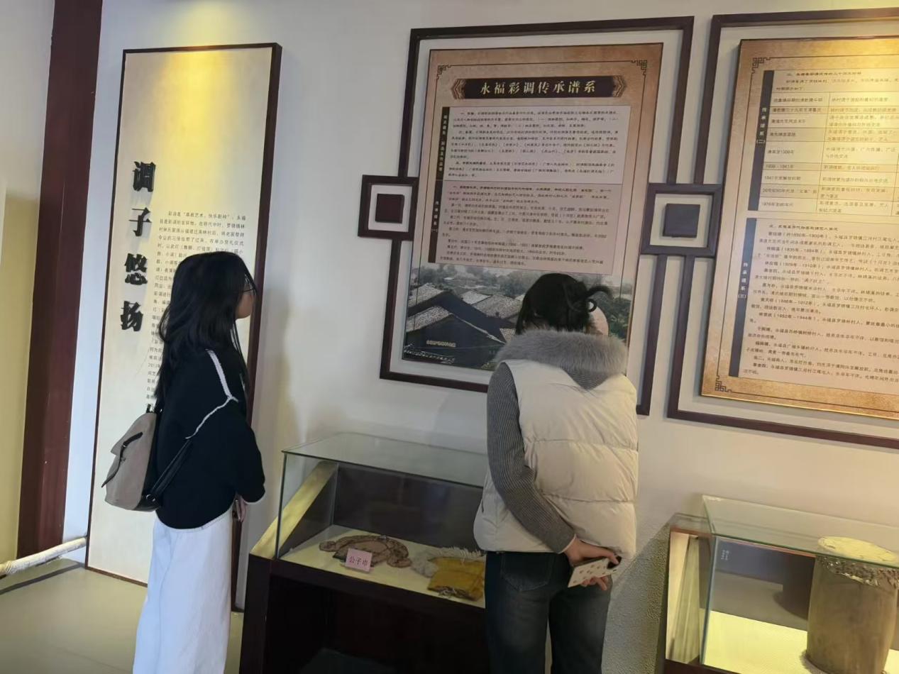 随后,实践团走进永福博物馆,在彩调专属展区观摩了老艺人演出剧照、戏服头冠、伴奏道具等珍贵展品,完整了解了彩调从民间小调发展为成熟剧种的历程,并与工作人员探讨了彩调保护现状与传承困境,进一步明晰非遗活化利用的重要意义。