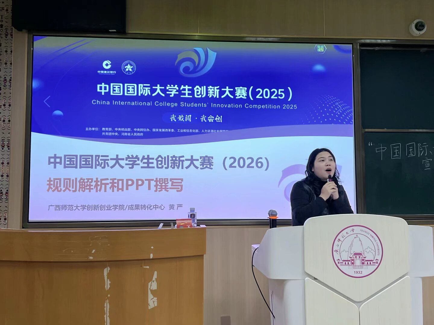 宣讲会上,黄严老师围绕赛事核心要点展开详细解读,重点突出、针对性强。首先,她简要介绍了国创赛赛事背景及历年获奖概况,重点通报了2025年学校在国赛、区赛中的优异成绩,用翔实数据彰显赛事含金量与学校备赛实力,进一步激发学生参赛积极性。