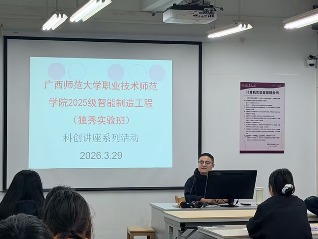 为进一步夯实独秀班学子科研基础、培育科学思维与学术素养,3月29日,职业技术师范学院2025级智能制造工程本科生独秀班系列学术讲座首场活动——“关于科学研究的思考”主题讲座顺利举行。本次活动特邀机械工程系陈林涛副教授担任主讲嘉宾,2025级独秀班全体同学参与学习。