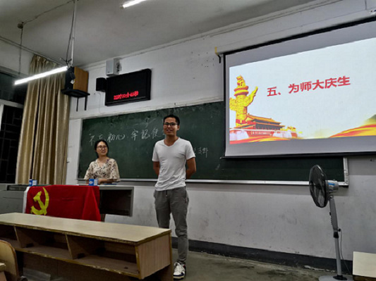 为深入推进贯彻习近平总书记在中央政治局第十五次集体学习重要讲话精神,隆重纪念建党98周年、新中国成立70周年,扎实推进“不忘初心、牢记使命”主题教育,10月12日职师研究生党支部书记蓝莹组织支部11名党员和13名积极分子在文科楼101教室观看《黄大年同志先进事迹》记录片。